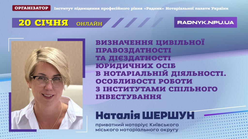 20 січня запрошуємо на онлайн-семінар “Визначення цивільної правоздатності та дієздатності юридичних осіб в нотаріальній діяльності. Особливості роботи з інститутами спільного інвестування”