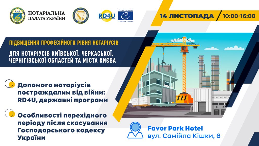 14 листопада у Києві офлайн та онлайн відбудеться захід з підвищення професійного рівня для нотаріусів Київської, Черкаської, Чернігівської областей та міста Києва.