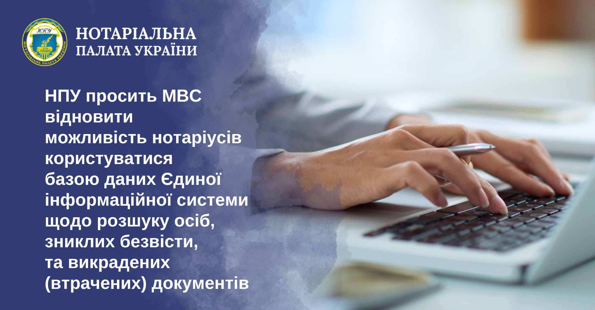 Нотаріальна палата України звернулася до Міністерства внутрішніх справ України з приводу відсутності у нотаріусів можливості користуватися базою даних Єдиної інформаційної системи щодо розшуку осіб, зниклих безвісти, та викрадених (втрачених) документів за зверненнями громадян.