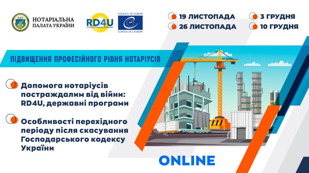 Анонсуємо розклад наступних безкоштовних онлайн-заходів з підвищення професійного рівня для нотаріусів на тему «І. Допомога нотаріусів постраждалим від війни. ІІ. Особливості нотаріальних та реєстраційних дій в перехідний період після скасування Господарського кодексу України».