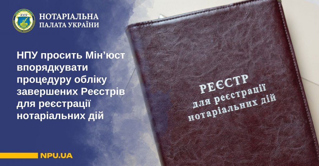 Нотаріальна палата України звернулася до Міністерства юстиції України з клопотанням щодо необхідності вдосконалення питання внесення інформації про закінчення ведення нотаріусами Реєстрів для реєстрації нотаріальних дій у Журналах обліку реєстрів для реєстрації нотаріальних дій: https://npu.ua/wp-content/uploads/2026/02/060226.pdf